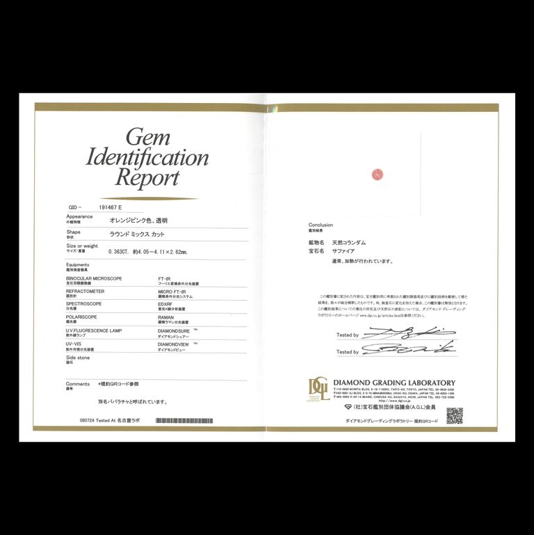 パパラチャサファイア(宝石名サファイア/別名パパラチャ・サファイア)スリランカ/マダガスカル産 DGL鑑付 0.363ct / 4.05x4.11mm前後 [260131619]