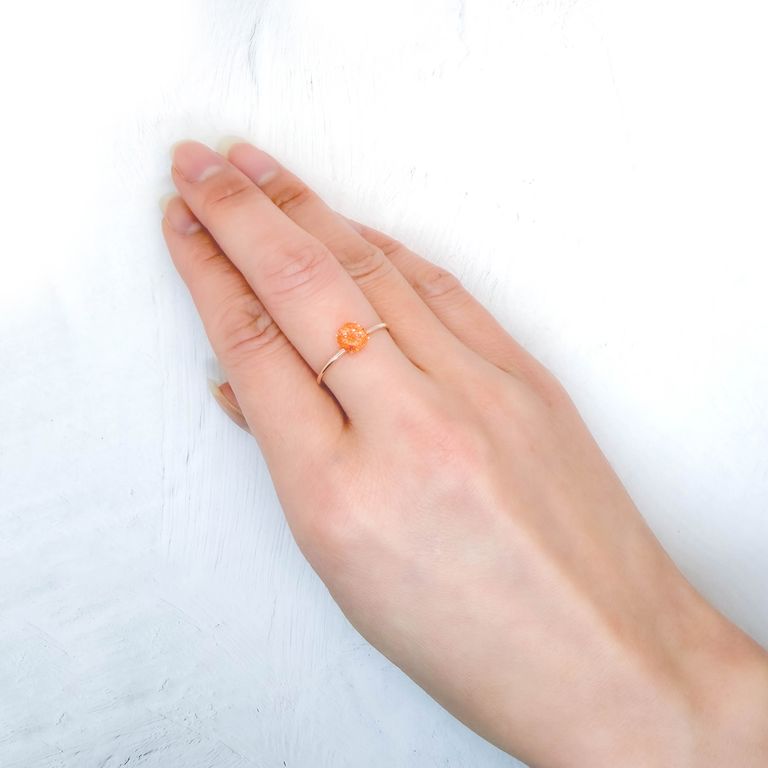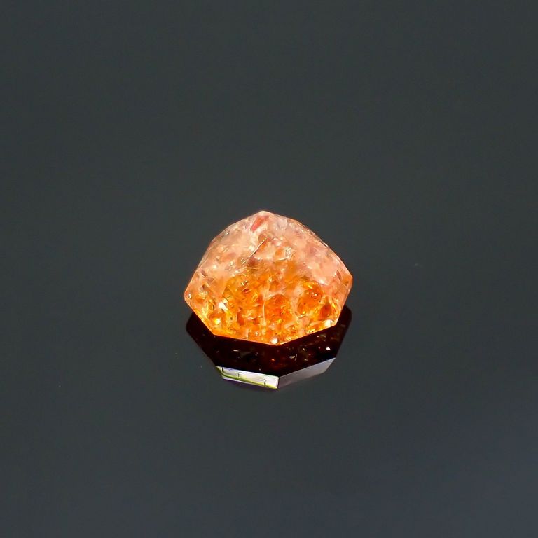 ややイエローがかったクリアなボディカラーの中に、オレンジや赤のラメ状インクルージョンがぎらりと輝くアベンチュリン長石、それがイリュージョンサンストーンです。