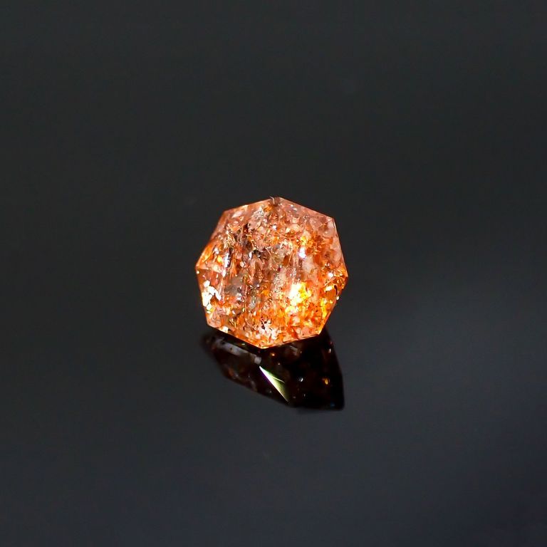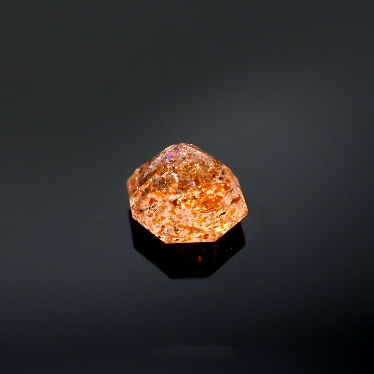 ややイエローがかったクリアなボディカラーの中に、オレンジや赤のラメ状インクルージョンがぎらりと輝くアベンチュリン長石、それがイリュージョンサンストーンです。
