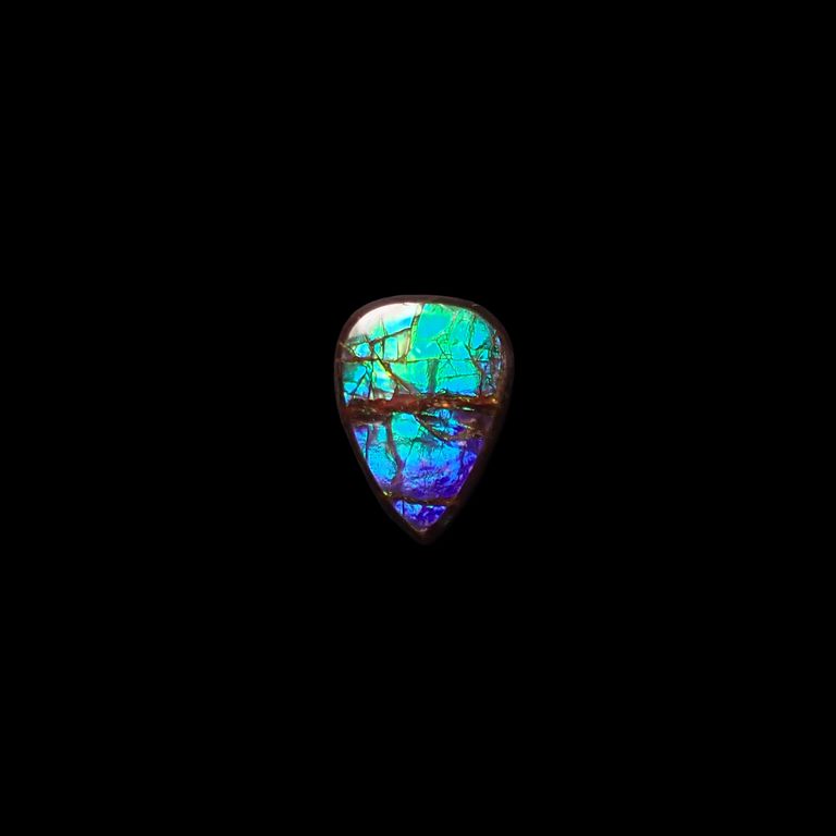 オパールの遊色効果では赤い色がもっとも出づらいとされていますが、アンモライトでは、アラゴナイト層の厚みがしっかりしている赤~緑の色が比較的現れやすく、青~紫の色合いは薄い層の部分に現れるため、脆く壊れやすいアンモライトでは手に入りにくい希少なカラーといわれています。