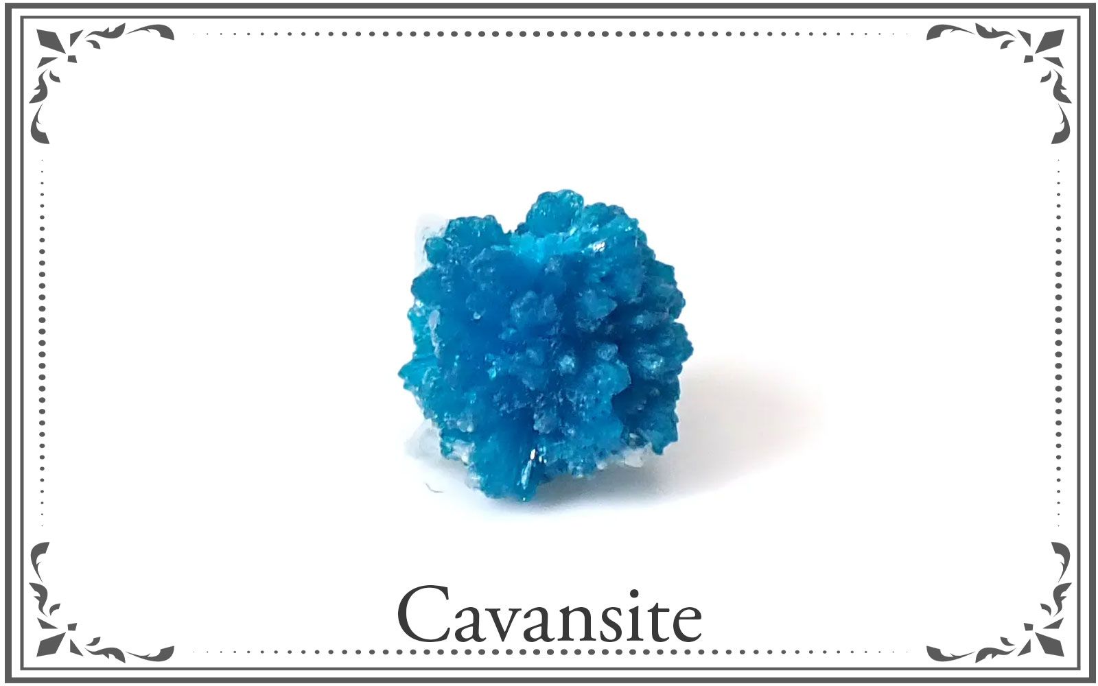濃厚なエレクトリックブルー~ブルーグリーンの色を持ち、個性的な結晶の形で現れます。柱状結晶の形状をとりますが、それが少しずつずれて重なっていくため、カーネーションのような、金平糖のような、面白いものではリボンパスタのような形だったりもします。特徴的なブルーは、タンザナイトのブルーと同じ、バナジウムでの発色という希少な鉱物です。