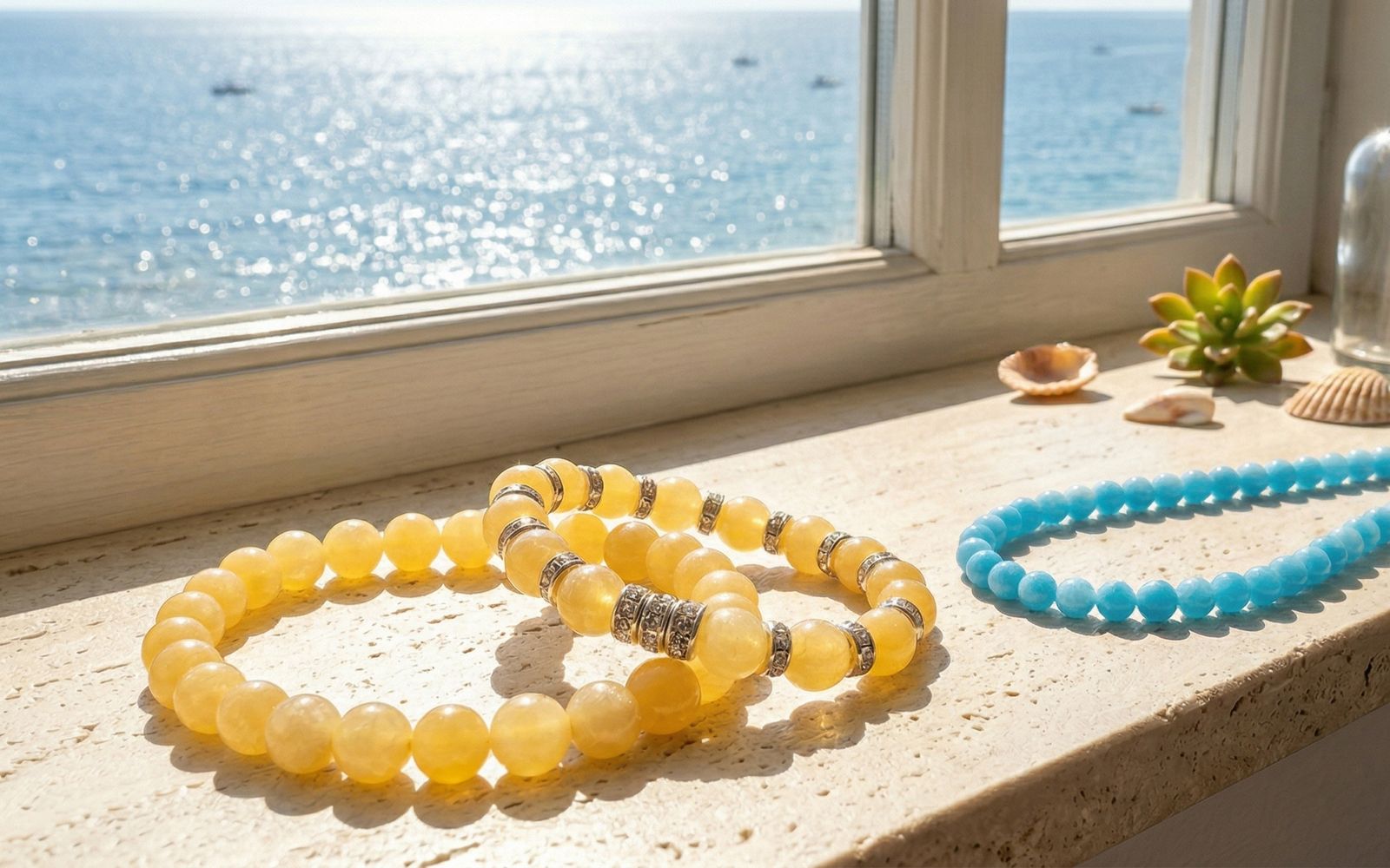 ビーズに加工されたアラゴナイトは、ブレスレットやお守りとして流通しています。カラーは黄色や白、ピンク、水色などさまざまですが、なかでもミルキーな黄色のアラゴナイトは特に人気があります。