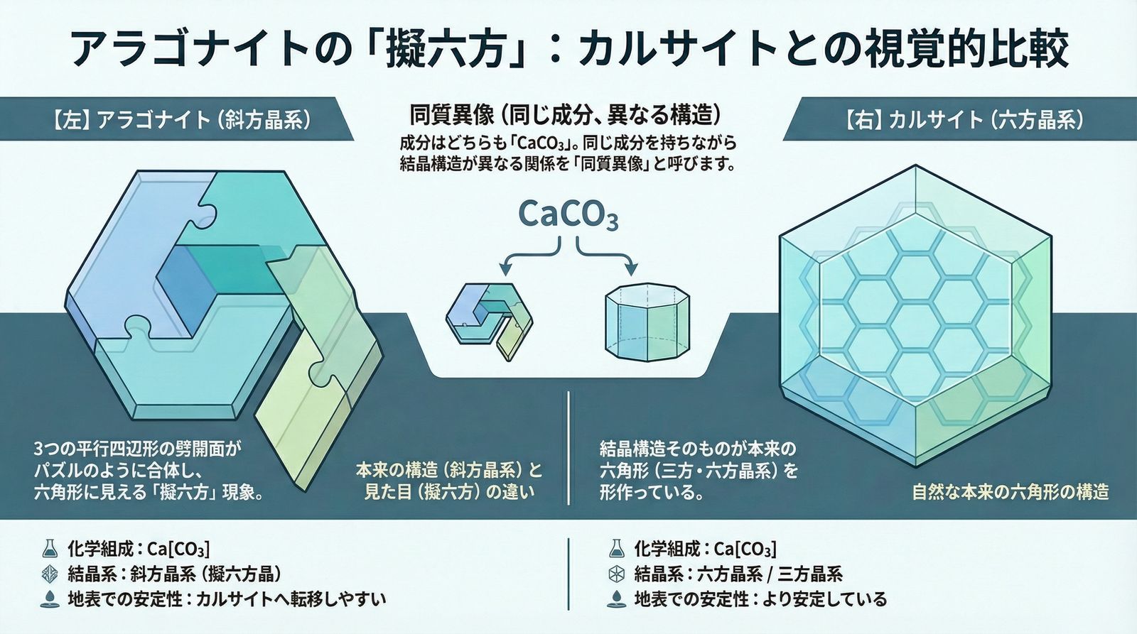 また、アラゴナイトの結晶が時間の経過とともにカルサイトへと変化することもあり、この現象は「転移(インバージョン)」と呼ばれています。