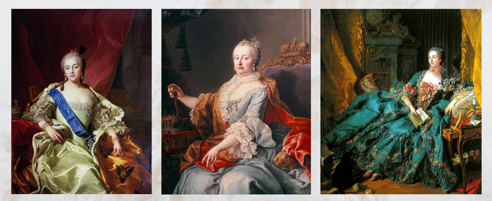 1750年、フリードリヒ2世をどうにかしてやりたいマリア・テレジアは、同じくフリードリヒ2世を嫌うロシアの女帝エリザヴェータと、更に怨敵の間柄だったフランスの公妾ポンパドゥール夫人とプロイセン包囲網を敷くべく連帯します。三枚のペチコートの共謀と呼ばれる密約です。
