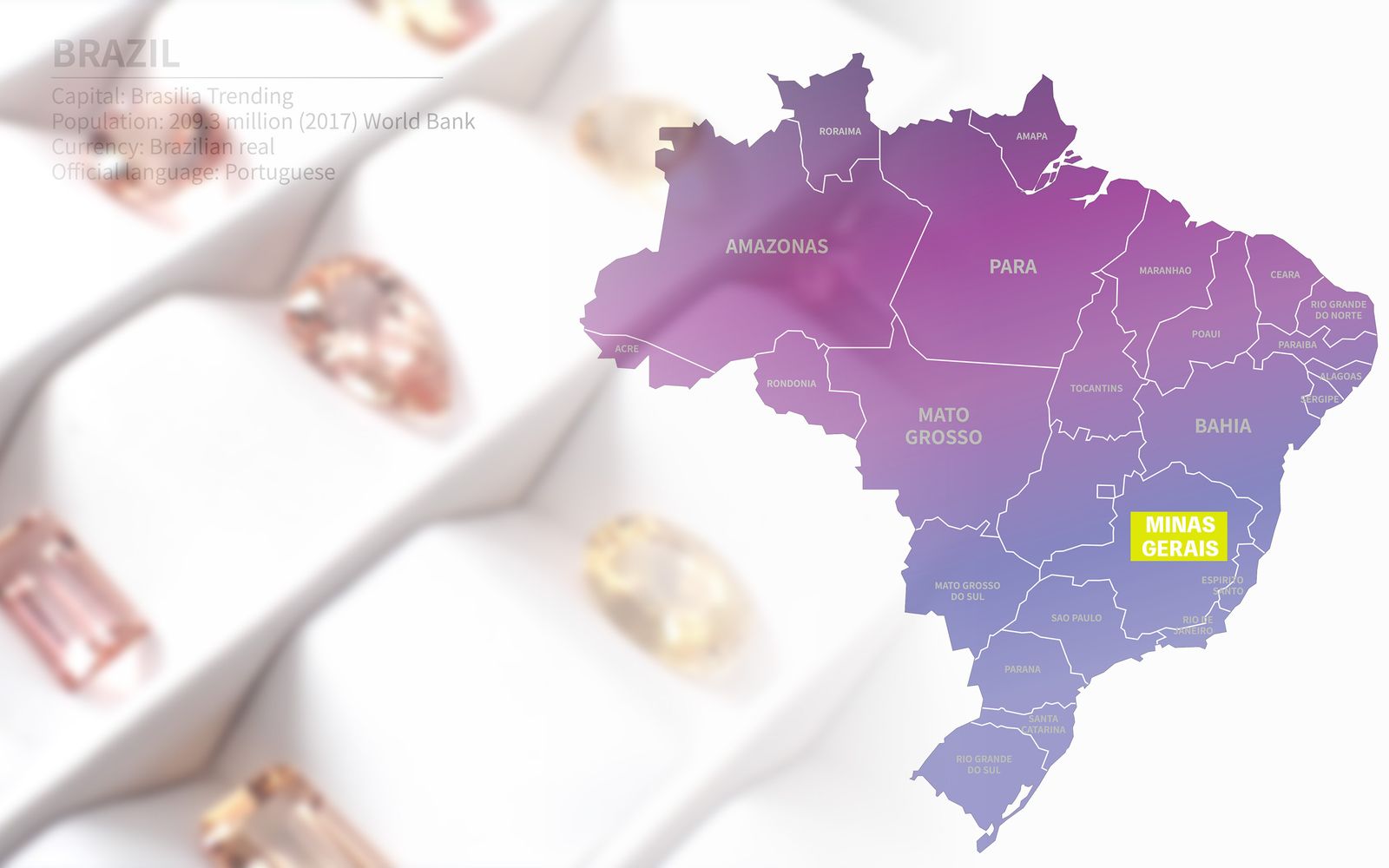 インペリアルトパーズの産地は唯一、ブラジルのミナスジェライス州オウロ・プレト地域だけでした。唯一の産地であるだけでなく、良質なインペリアルトパーズが多く産出されています。現在も、赤味のあるシェリーカラーのインペリアルトパーズのほとんどがオウロ・プレト産です。